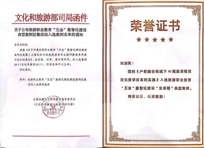 近日,文化和旅游部科技教育司旅游職業教育教指委公布“五金”數智化建設“金課程”典型案例名單,我校《產教融合視域下AI賦能課程項目化教學改革實踐》案例成功入選。