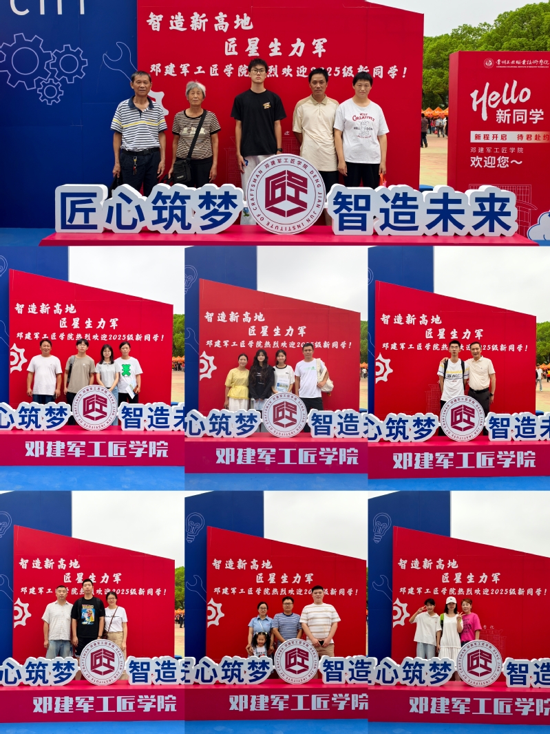 刻有“鄧建軍工匠學(xué)院”院訓(xùn)的文化墻成為溫馨的“打卡點(diǎn)”,新生與家長們紛紛駐足合影。有的家庭全員出鏡,笑容里滿是對未來的期許;有的新生與新同學(xué)并肩而立,眼神中透著對專業(yè)學(xué)習(xí)的向往;還有的家長主動與老師、志愿者合影,傳遞對學(xué)院的信任與感謝。“這張合影不只是孩子入學(xué)的紀(jì)念,更是我們家校攜手的起點(diǎn)。” 一位新生家長的心聲,道出了家校協(xié)同育人的共識。