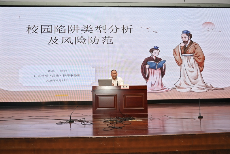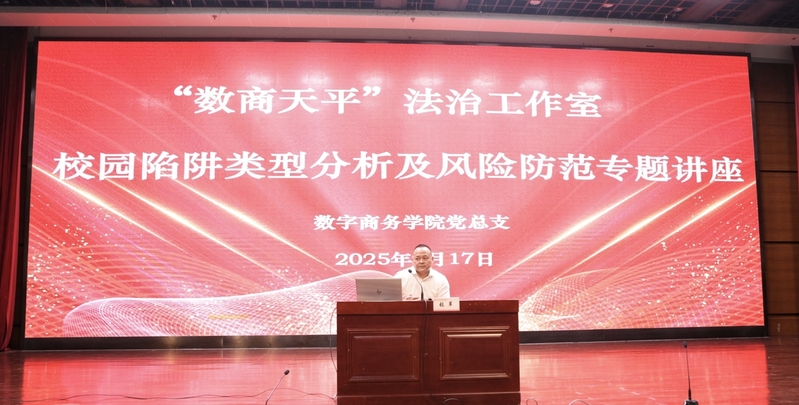 9月17日,數字商務學院“數商天平”法治工作室面向2025級新生舉辦“校園陷阱類型分析與風險防范”法治講座。本次活動特邀江蘇常明(武進)律師事務所張革律師擔任主講。