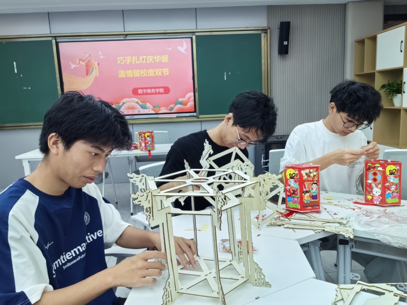 此外,旅游與康養學院將關懷直接送至學生社區。黨總支副書記郭媛帶領學工團隊走進“一站式”社區的“旅途會客廳”,與留校學生圍坐交流,隨后更深入宿舍,實地了解同學們的住宿環境與生活保障,親切詢問“宿舍還住得習慣嗎?”“學習上有沒有困難?”,將深切關懷送至每一位學子身邊。數字商務學院精心組織了“巧手扎燈慶華誕,溫情留校度雙節”主題活動。在輔導員的指導下,留校學生們親手制作燈籠,繪制五星紅旗,書寫美好寄語。一盞盞點亮的手工燈籠,不僅鍛煉了學生的動手能力,更成為了一堂生動的傳統文化實踐課,讓學子在體驗中紓解鄉愁,凝聚家國情懷。