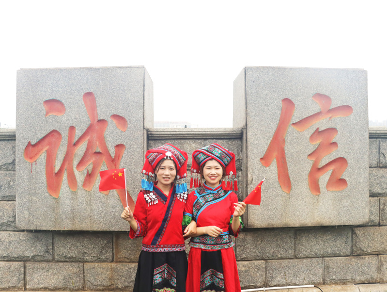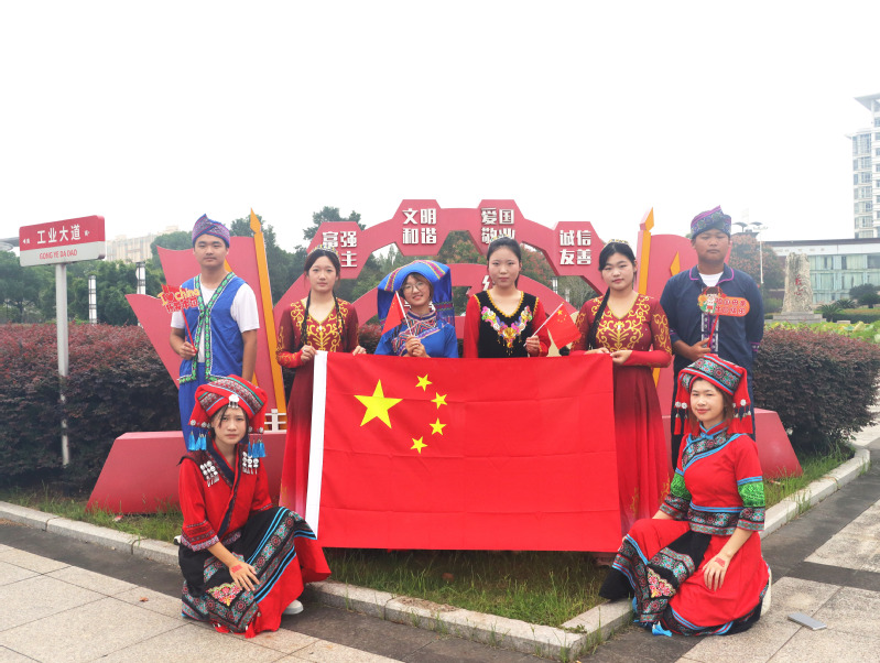 在“我與國旗合張影”創意攝影活動中,同學們身著各具特色的民族盛裝,與鮮艷的五星紅旗創意同框。壯族學生身著絢麗的民族服裝,手舉祝福祖國的標語牌和小國旗;土家族學生身著傳統織錦服飾,在國旗下歡快展示擺手舞的獨特韻味。同學們還自發組成“同心圓”隊形,寓意各民族像石榴籽一樣緊緊抱在一起。這些充滿創意的合影,既展現了各民族文化的豐富多彩,又表達了各族青年對祖國的深厚情感。