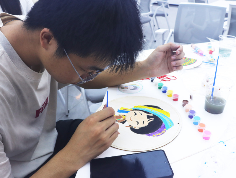 在民族風主題掛飾制作環節,同學們充分發揮創意,先在圓形木盤上精心繪制各族人物畫像,然后系上親手編織的中國結,組裝成獨具特色的民族團結主題掛飾,每個掛飾都展現一個民族的特色服飾和文化符號。“此次活動十分有新意,不僅讓我提升了繪畫技能,更深入了解了各民族的文化特色。”參加活動的土家族學生楊鑫宇在展示作品時說道。
