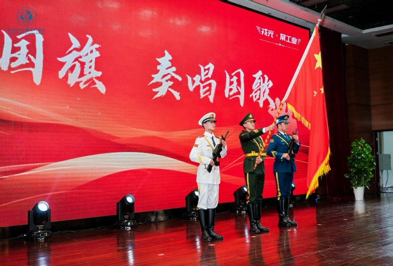 下午2時,國旗護衛隊隊員擎著鮮艷的五星紅旗,登上主席臺,雄壯的《義勇軍進行曲》在千人報告廳奏響,全體與會人員高唱國歌,并向國旗敬禮。