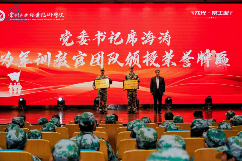 總結表彰大會上,黨委書記席海濤代表學校向2025級軍訓教官團隊負責同志頒發榮譽牌匾。