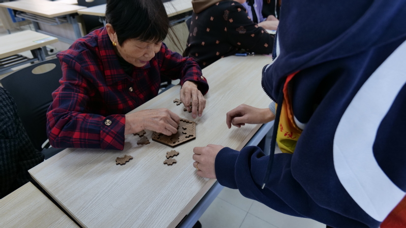 投壺套圈,益智歡樂多。益智活動現場,老人們熱情高漲,手持箭矢或套圈,全神貫注地瞄準目標。有的精準地落入壺中,引得周圍一片歡呼,有的則遺憾地偏出,但大家并不氣餒,繼續嘗試。現場歡聲笑語不斷,氣氛熱烈而融洽。與此同時,益智拼圖區域也吸引了不少老人。老人們圍坐在一起,耐心地拼湊著手中的拼圖。他們互相交流、幫助,共同解決難題。當一幅完整的拼圖呈現在眼前時,老人們臉上露出了滿足的笑容。這個活動不僅鍛煉了老人們的大腦,還增進了彼此之間的感情。