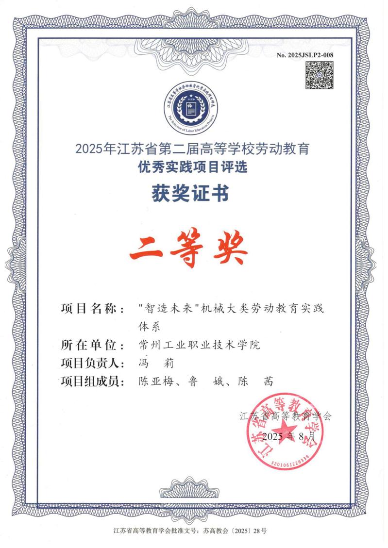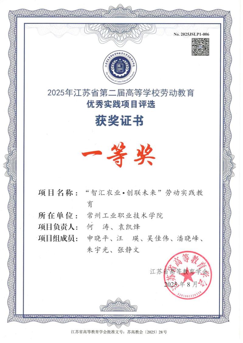 近日,江蘇省高等教育學會2025年高等學校勞動教育優秀實踐項目評選結果出爐,我校信息工程學院何濤、袁凱烽, 智能控制學院夷文玉、蔣金偉的項目獲一等獎,機械與交通學院馮莉的項目獲二等獎。同時,我校獲評江蘇省第二屆高等學校勞動教育優秀實踐項目評選活動優秀組織獎。