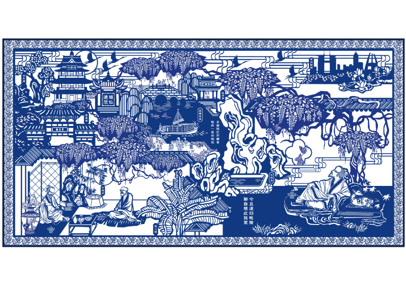 該作品在蘇東坡誕辰988周年與常州第十五屆東坡國際文化節之際應運而生,成為以非遺藝術詮釋廉潔文化的生動典范。作品匠心獨運,巧妙引用蘇軾名句,并融合金壇刻紙細膩鏤空的技藝精髓。畫面中,“紫藤清影”與“竹影清風”等意象交織“顧塘迎坡”“坡仙遺范”等歷史典故,生動再現了蘇軾于貶謫逆境中仍心系民生、廉潔自守的曠達襟懷。方寸之間,紙薄意深,創作者以層疊刀法精準刻畫出蘇軾衣衫簡樸而神情堅定的形象,深刻揭示出“此心安處”并非退隱獨善,而是植根于“為民請命”廉政實踐的崇高境界。尤為巧妙的是,作品以蘇軾親手種植的紫藤為視覺紐帶,將歷史的艤舟亭、青果巷與現代化的常州城市剪影串聯一體,輔以常州市花月季為飾,象征清廉美德跨越古今、生生不息的精神傳承。