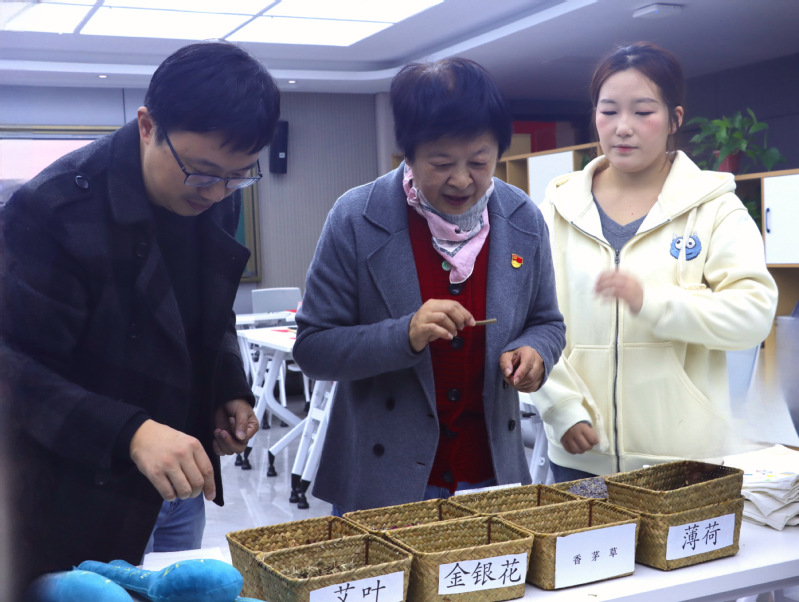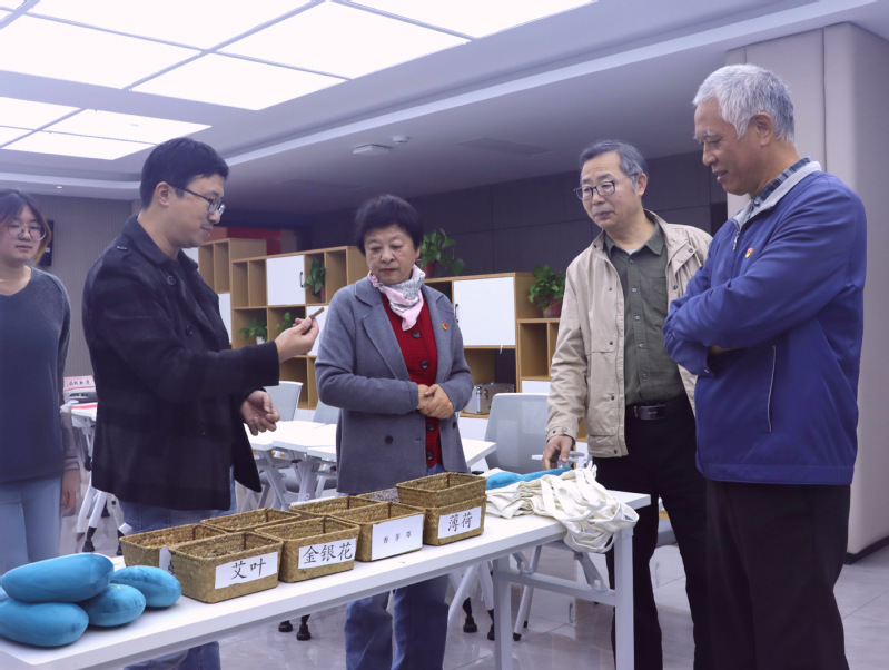 活動現場,本草社學生向三位老同志展示了自主研發的中藥養生錘、中藥枕、中藥香皂和艾草貼等文創產品。學生結合人體經絡圖,詳細講解了艾草、薰衣草等藥材的配伍原理及功效,現場演示穴位按摩手法。張燏試用中藥養生錘后,對學生的創新設計給予高度評價:“將傳統藥材與現代工藝結合,既弘揚了中醫藥文化,又體現了青年學子的實踐智慧。”金華仁和趙呂明還與學生互動體驗了辨識藥材、調配藥材比例等環節,感受“藥食同源”的文化魅力。三位老同志分別與家庭困難學生結對幫扶,現場互留聯系方式。三位老同志結合自身經歷,勉勵學生扎根專業、服務社會。