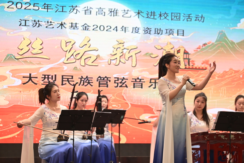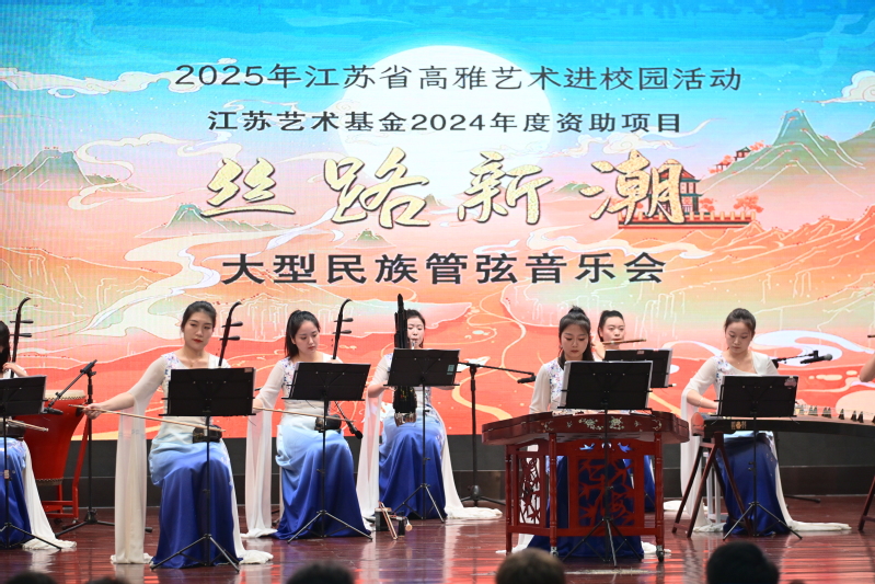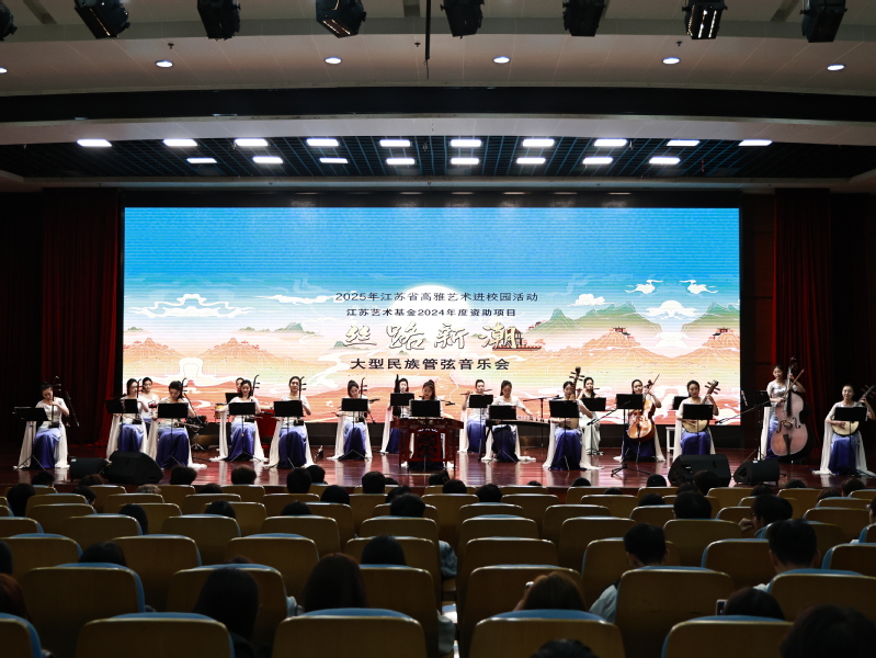 11月12日,江蘇省高雅藝術進校園項目——江蘇女子民族樂團“絲路新潮”大型民族管弦音樂會走進我校。學校特別組織了“一帶一路”合作國家的海外學生與本校師生共同觀演,現場逾千名師生沉浸于民族音樂的魅力之中,共同感受絲路文化的時代新聲。