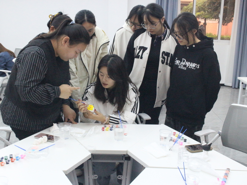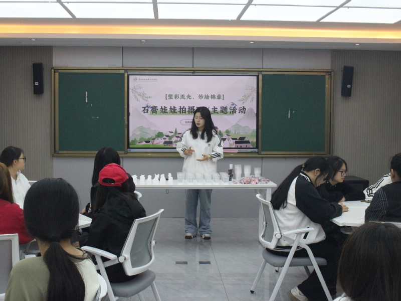 活動現場,社團負責人鄭雅之講解了創作規則、流程及材料使用注意事項,并展示了色彩鮮活、造型靈動的石膏娃娃成品范例,點燃了同學們的創作熱情。