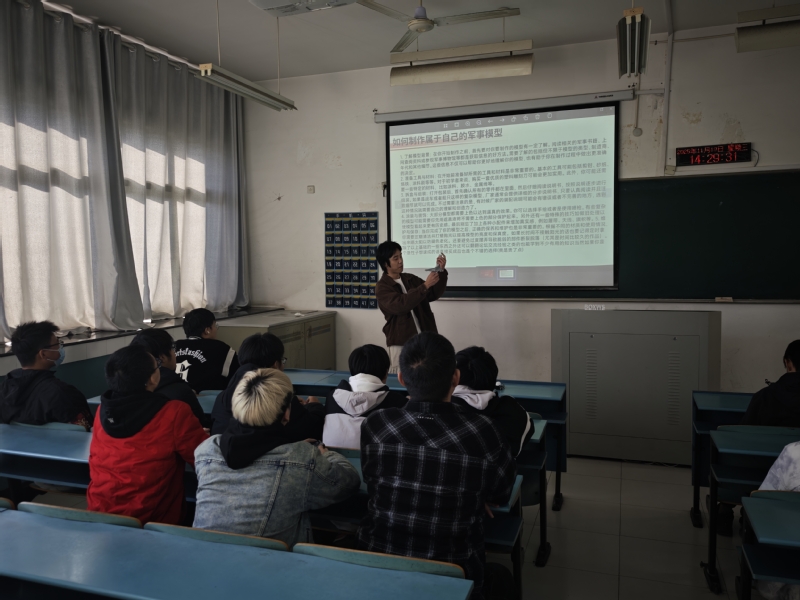 活動中,社長向同學(xué)們詳細(xì)講解了軍事模型的基本分類、發(fā)展歷程以及不同時(shí)期代表性武器裝備的特點(diǎn)。從陸地馳騁的裝甲車,到翱翔天際的戰(zhàn)機(jī),再到碧波深潛的艦艇,豐富的知識介紹拓寬了同學(xué)們的眼界,加深了大家對軍事科技與國防建設(shè)的理解。