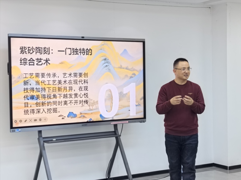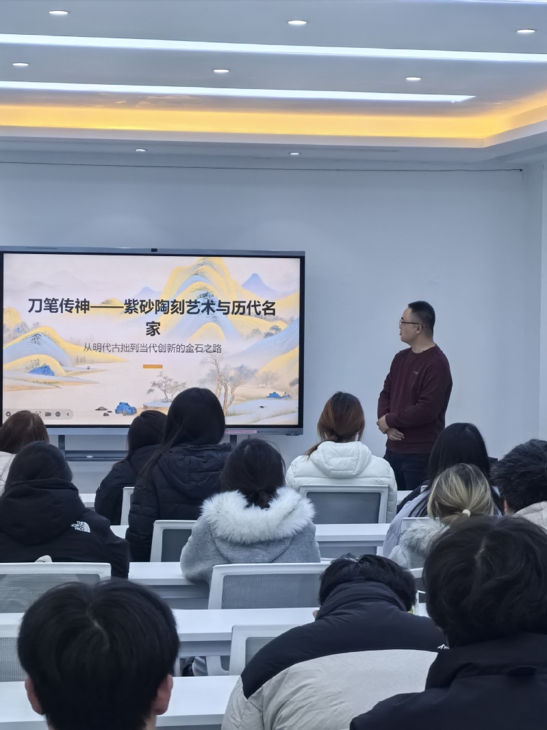 11月19日,常州市工藝美術(shù)大師張毓陽應(yīng)邀為我校藝術(shù)創(chuàng)意學(xué)院2025級學(xué)生開展“刀筆傳神——紫砂陶刻藝術(shù)與歷代名家”專題講座。講座由藝術(shù)創(chuàng)意學(xué)院副院長唐一鑫主持。