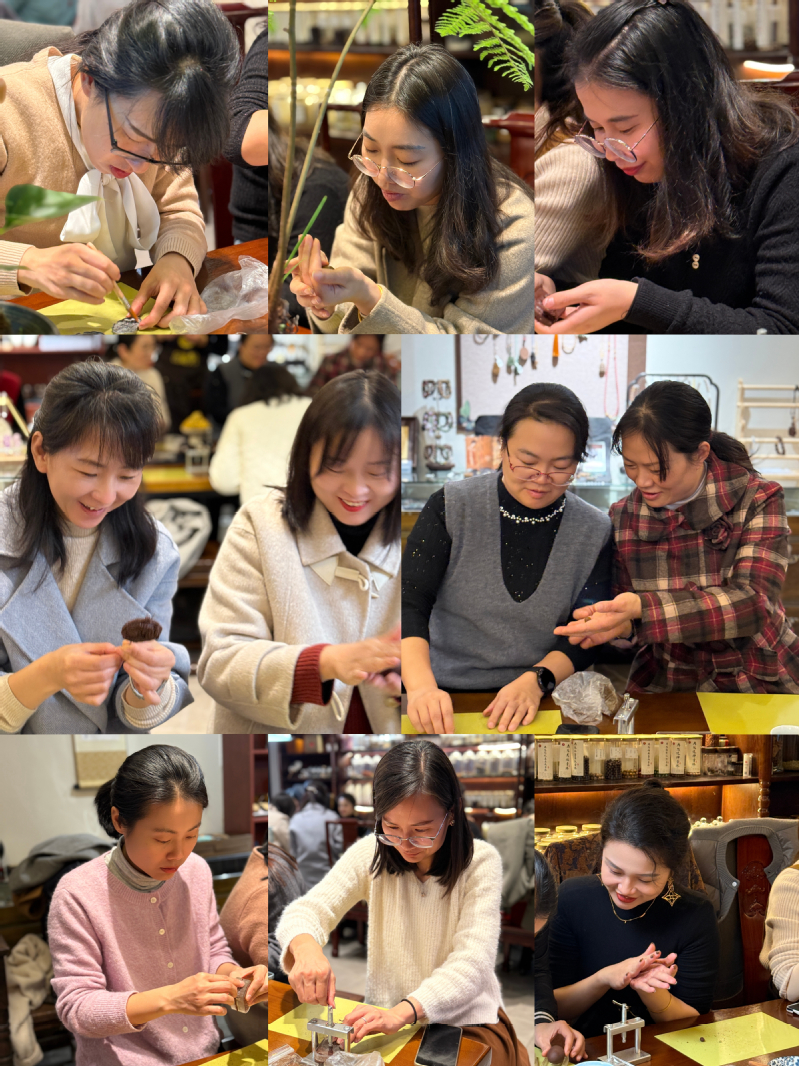 手作體驗環節,老師們在優雅寧靜的空間里,先凈手再熏香,口含丁香靜心而坐。在合香制作專家的指導下,老師們親手調配中藥材,或揉制成精致的中藥合香香牌,或串成雅致的合香手串。每件作品既可佩戴于身,便于隨時聞香養生;亦可放置于辦公場所或車內,起到凈化環境之效。現場氣氛輕松活潑,老師們于一揉一捻間體驗傳統手工藝的匠心獨運。活動還特設“暖意時光”休憩環節,準備了熱飲與茶點,大家圍坐交流,在藥香與茶香中共度靜謐溫暖的午后時光,進一步增進了交流,加深了同事情誼。