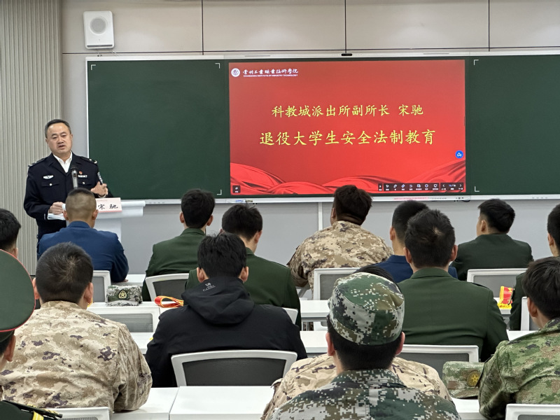 在退役士兵安全法治教育大會上,學校特邀科教城派出所副所長宋馳警官開展退役士兵安全法治教育宣講。宋警官圍繞防范網絡電信詐騙、大學生人身財產保護等常見安全問題,結合真實案例進行深入剖析。他提醒退役學生保持軍人的敏銳性和紀律意識,警惕各類新型詐騙手段,主動學習安全知識,積極參與平安校園建設。宣講既有法律知識普及,又有實操技巧傳授,為退役學生盡快適應校園生活提供了實用指導。