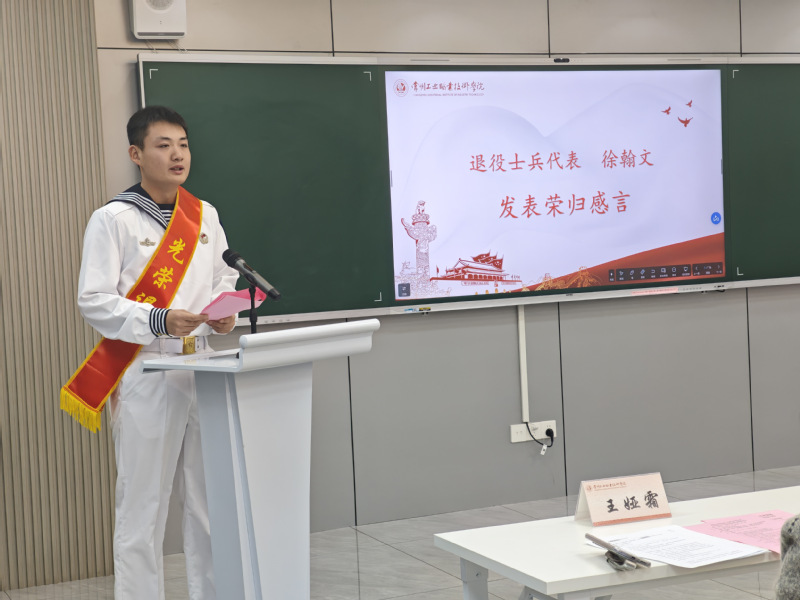 退役士兵代表徐翰文同學在發言中感恩軍隊的培養和學校的關懷,他追憶自己作為中國人民解放軍海軍一員的崢嶸歲月,分享了復學后以軍營精神攻克學業、踐行“脫下軍裝,本色不變”的經歷。
