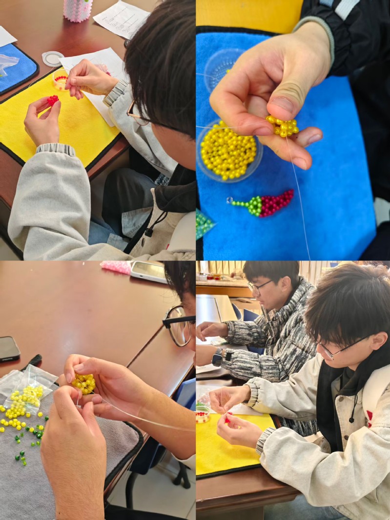 活動籌備期間,社團(tuán)骨干深入挖掘秋收民俗文化,結(jié)合串珠技法特點反復(fù)打磨作品設(shè)計。為呈現(xiàn)果蔬的天然質(zhì)感,社員們精心選材:高亮度水晶珠分層串制蘋果,凸顯其晶瑩剔透;橘色與金色疊珠疊加塑造柿子的圓潤飽滿;紅綠雙色珠交替編織還原胡蘿卜的紋理細(xì)節(jié)。