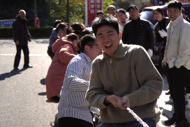 按照賽程安排,6支隊伍通過抽簽分為兩組,采用組內單循環賽制,一局定勝負,積分排名前兩名者晉級決賽。賽場上,隨著副院長蔣金偉一聲令下,各隊隊員緊握長繩,身體后傾,齊心協力往后拉。吶喊聲、加油聲、繩子摩擦地面的聲響交織在一起,回蕩在工匠樓周邊。經過多輪激烈角逐,電子教研室代表隊和機器人教研室代表隊憑借穩定的發揮和全勝的戰績,分別從兩組中脫穎而出,成功晉級決賽。