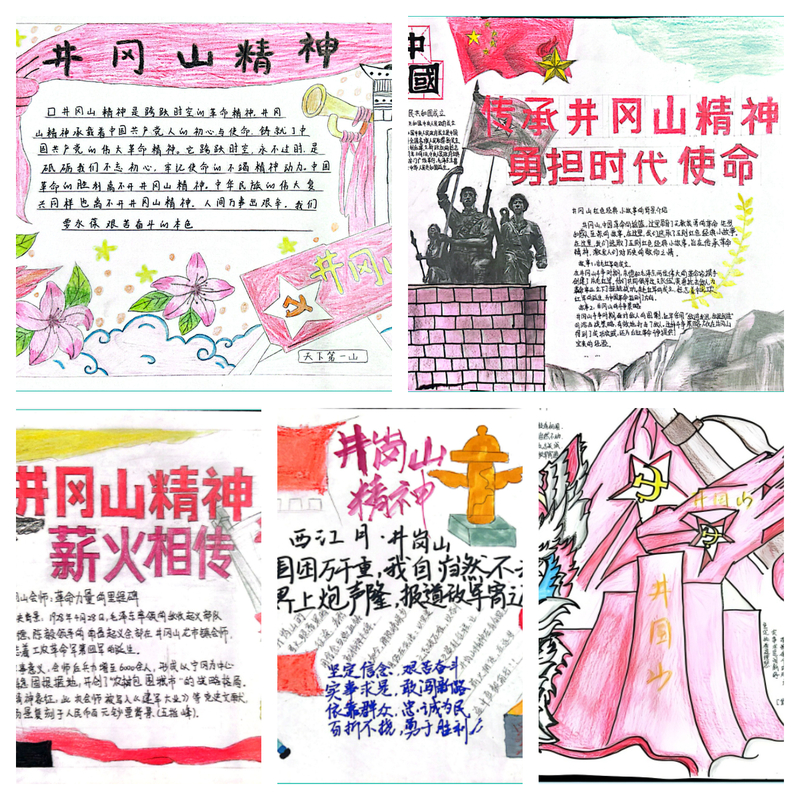 實(shí)踐團(tuán)成員在“一站式”學(xué)生社區(qū)活動(dòng)室組織手抄報(bào)創(chuàng)作。同學(xué)們以井岡山斗爭歷史為背景,用畫筆勾勒紅色印記。手抄報(bào)設(shè)計(jì)主題鮮明,既有“井岡山精神”“天下第一山”等藝術(shù)字標(biāo)題,也融入了號角、紅旗、五角星等象征元素,并配文闡釋井岡山精神“堅(jiān)定信念、艱苦奮斗、依靠群眾、勇于勝利”的核心要義。一名成員在創(chuàng)作中表示:“通過手繪,我更加體會到革命先輩在艱苦歲月中百折不撓的意志。”