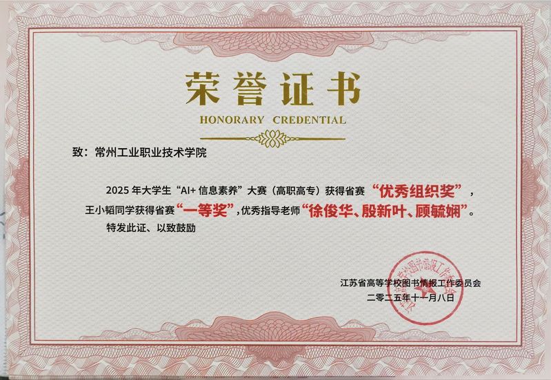 12月5日,從圖書館傳來喜訊,在近日舉辦的2025年江蘇省大學生“AI+信息素養”大賽(高職高專賽道)中,我校24人工智能現場工程師班學子王小韜憑借精準的檢索策略、嫻熟的生成式AI工具運用及穩健的臨場發揮榮獲一等獎,徐俊華、殷新葉、顧毓嫻獲評“優秀指導老師”,學校獲“最佳組織獎”。