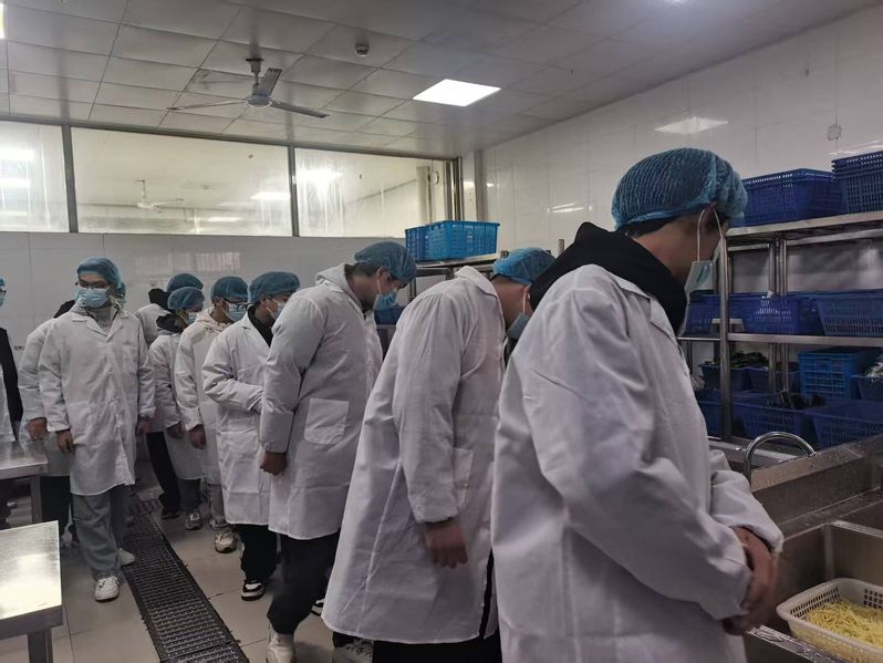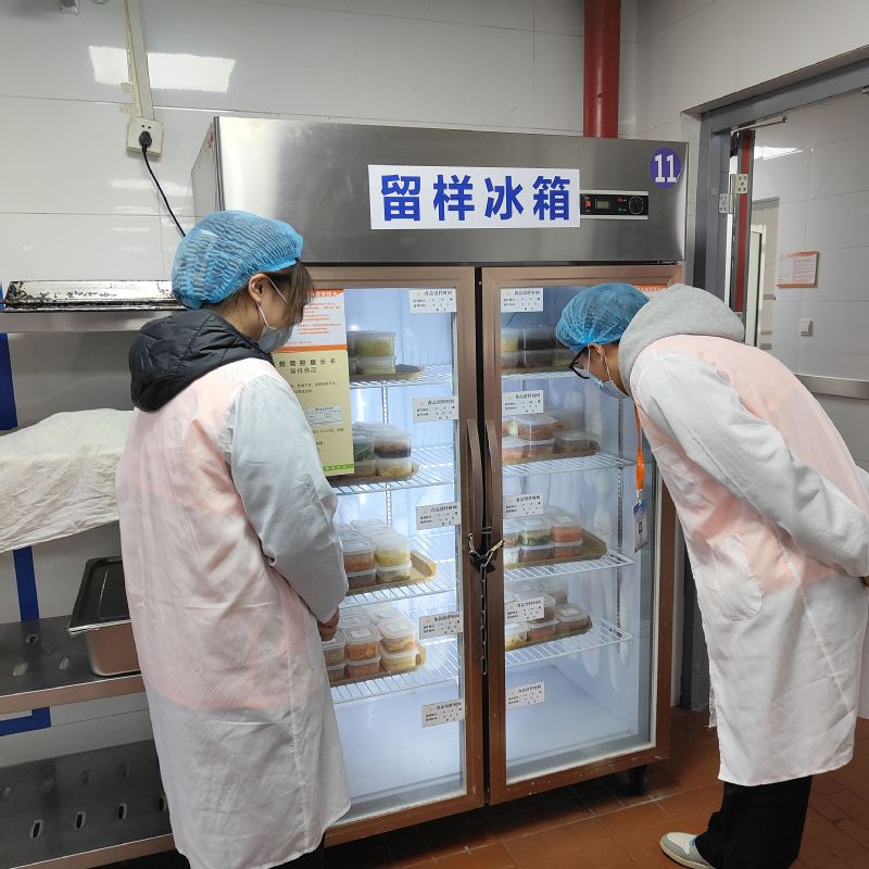 活動現場,在后勤與基建管理處負責人、食堂管理人員及各食堂現場負責人的帶領下,參與代表們嚴格遵守食堂衛生管理要求,佩戴一次性口罩、頭套有序進入食材儲存間、清洗消毒區、烹飪加工間、備餐間及食品留樣柜等核心區域。食堂現場負責人逐一介紹了從業人員健康管理、食材采購的“溯源體系”、餐具洗消流程等環節;重點講解了食品留樣的規范標準,確保食品安全可追溯。分類存放的食材、整潔有序的操作臺面、規范佩戴的工作人員工裝,讓代表們對校園餐飲的標準化管理有了直觀認知。