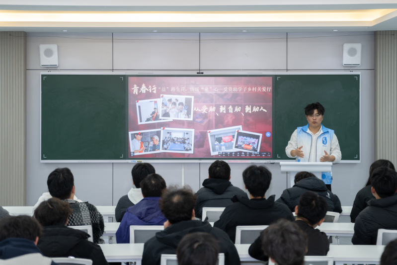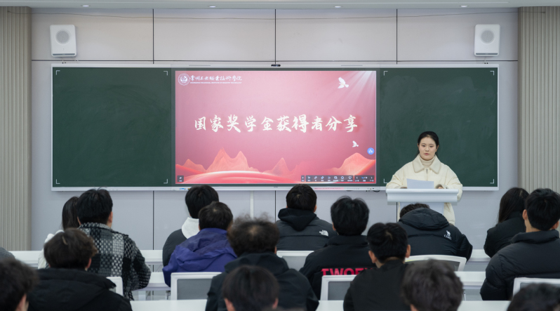 國家獎學金獲得者孫雨分享了自身的求學成長經歷。她結合專業學習、學科競賽、社會實踐等方面,講述了在政策支持下勤奮進取、突破自我的故事,傳遞了“勤學篤行、不負韶華”的正能量,為同學們樹立了榜樣。