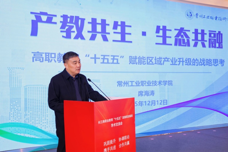 在主旨報告環(huán)節(jié),我校黨委書記席海濤作為長三角地區(qū)江蘇高職院校代表,作《產(chǎn)教共生·生態(tài)共融——高職教育“十五五”賦能區(qū)域產(chǎn)業(yè)升級的戰(zhàn)略思考》專題報告。他指出,“十五五”時期高職教育的核心使命在于緊密對接《教育強(qiáng)國建設(shè)規(guī)劃綱要(2024-2035年)》文件要求,成為服務(wù)新質(zhì)生產(chǎn)力發(fā)展的“主基地”、促進(jìn)更高質(zhì)量就業(yè)的“穩(wěn)定器”、構(gòu)建融通融合體系的“立交橋”、教育教學(xué)化轉(zhuǎn)型的“先行區(qū)”以及服務(wù)國家戰(zhàn)略的“助推器”。他通過對比長三角、粵港澳大灣區(qū)、京津冀等三大城市群數(shù)據(jù),展現(xiàn)了長三角地區(qū)雄厚的產(chǎn)業(yè)基礎(chǔ)與活躍的經(jīng)濟(jì)動能,特別是江蘇高校資源豐富和一流企業(yè)集群的顯著優(yōu)勢。