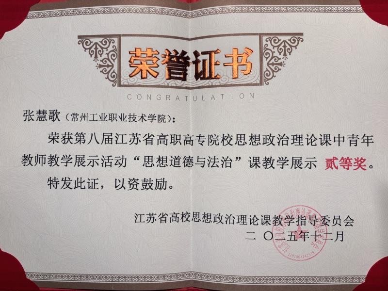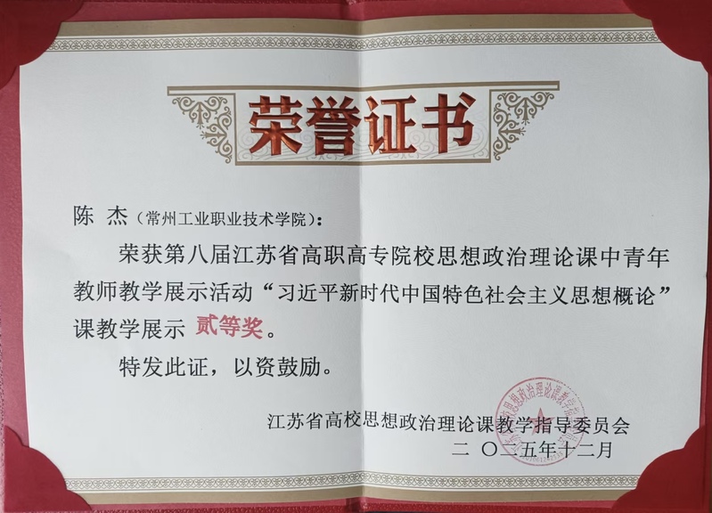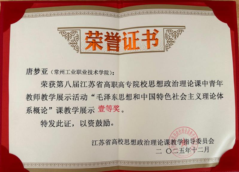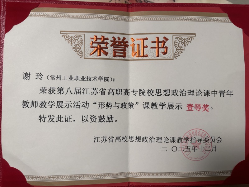12月14日,第八屆江蘇省高職高專院校思想政治理論課中青年教師教學展示活動圓滿收官。我校馬克思主義學院教師憑借扎實的理論功底、精湛的教學技藝與出色的現場表現,在激烈競爭中脫穎而出,斬獲佳績:唐夢亞、謝玲老師分獲“毛澤東思想和中國特色社會主義理論體系概論”“形勢與政策”課程組一等獎,張慧歌、陳杰老師分獲“思想道德與法治”“習近平新時代中國特色社會主義思想概論”課程組二等獎。