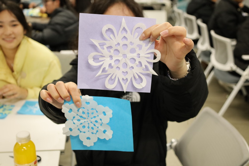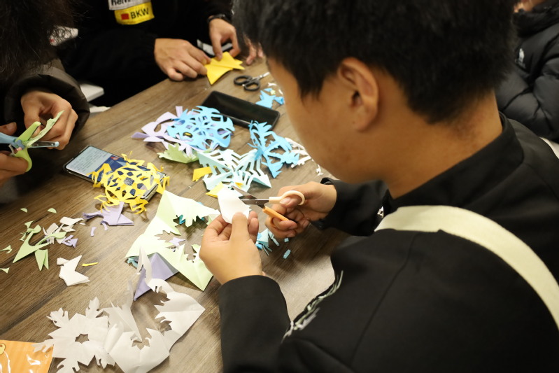 此外,學院還組織學生干部和部分家庭經濟困難同學開展創(chuàng)意手作活動?;顒蝇F(xiàn)場,同學們在輕松愉快的氛圍中學習剪紙技巧,一張張彩紙在指尖翻飛,化作一幅幅精美的雪花圖案。此次活動將傳統(tǒng)美育與心理關懷相結合,旨在通過動手實踐緩解學子壓力,培養(yǎng)審美情趣,讓資助工作從經濟支持延伸到精神滋養(yǎng)。