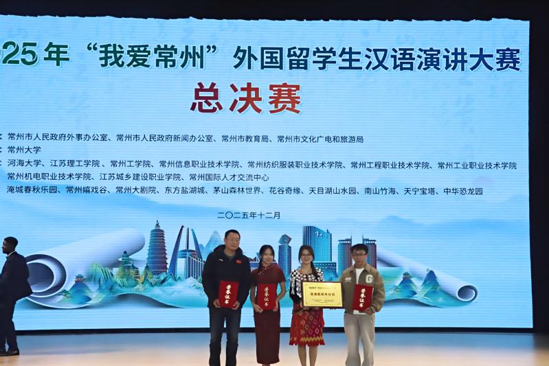 12月18日,2025年“我愛常州”外國留學(xué)生漢語演講大賽總決賽在常州大學(xué)西太湖校區(qū)舉行。在學(xué)校國際與港澳臺事務(wù)處、學(xué)工處的組織指導(dǎo)下,海外教育學(xué)院遴選留學(xué)生C C HTOI PAN(中文名:陳紫怡)憑借扎實的漢語功底與真摯的情感表達(dá)脫穎而出,斬獲一等獎,留學(xué)生JA SENG TAWNG(中文名:楊藝萍)獲二等獎,費(fèi)建明、高陽老師榮膺“優(yōu)秀指導(dǎo)教師”獎,學(xué)校獲評“優(yōu)秀組織單位”。