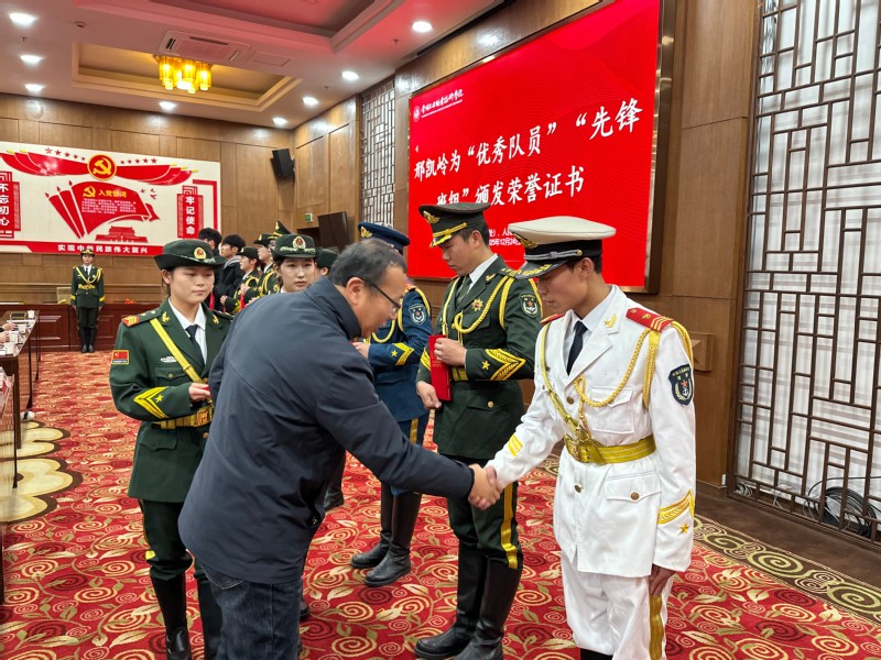 大會(huì)在莊嚴(yán)的迎國旗和奏唱國歌儀式中開幕。學(xué)生工作處綜合管理科科長(zhǎng)王驍俊宣讀第九屆國旗護(hù)衛(wèi)隊(duì)表彰決定。學(xué)生工作部(處)、心理健康中心、人民武裝部部長(zhǎng)邢凱嶺為受表彰的“優(yōu)秀隊(duì)員”及“先鋒班組”頒發(fā)榮譽(yù)證書和流動(dòng)紅旗。學(xué)生工作處蔣晨宣讀《第九屆國旗護(hù)衛(wèi)隊(duì)隊(duì)員退役的通知》,邢凱嶺為國護(hù)隊(duì)退役隊(duì)員佩戴印有“光榮退役”字樣的綬帶。優(yōu)秀退役隊(duì)員代表劉成宇、耿靜茹同學(xué)分別發(fā)表臨別感言,他們回顧了在國旗護(hù)衛(wèi)隊(duì)的崢嶸歲月,并勉勵(lì)新隊(duì)員不忘入隊(duì)初心,牢記光榮使命,扛起責(zé)任擔(dān)當(dāng)。學(xué)生工作部(處)、心理健康中心、人民武裝部綜合教育科科長(zhǎng)張帥宣讀《第十屆國旗護(hù)衛(wèi)隊(duì)隊(duì)員任命書》。人民武裝部專武干部袁偉民為新一屆國護(hù)隊(duì)骨干頒發(fā)聘書。王啟昌同學(xué)代表第十屆國護(hù)隊(duì)新隊(duì)員發(fā)言,許下了“以我青春,捍衛(wèi)國旗”的誓言。邢凱嶺為第十屆國護(hù)隊(duì)授劍授旗,新老隊(duì)員舉行禮兵槍交接儀式。第十屆國旗護(hù)衛(wèi)隊(duì)隊(duì)員集體合唱《天安門國旗護(hù)衛(wèi)隊(duì)隊(duì)歌》,激昂嘹亮的歌聲展示了新一屆國旗護(hù)衛(wèi)隊(duì)隊(duì)員的別樣風(fēng)采。