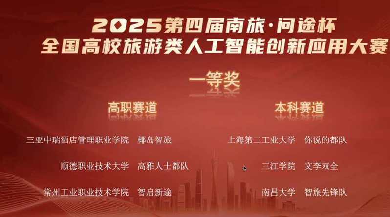 12月28日,由江蘇省文化旅游職業教育行業指導委員會、江蘇旅游職業教育集團、南京旅游職業學院和廣州市問途信息技術有限公司共同主辦的第四屆“南旅?問途杯”全國高校旅游類人工智能創新應用大賽圓滿落幕。由我校旅游與康養學院酒店管理與數字化運營專業陳嘉銘、劉佳、高思佳及孫薈4位同學組成的“智啟新途”隊獲高職組一等獎,戴新潼、董原榮、卜文茹及耿尚悠4位同學組成的“東方不敗”隊獲高職組優秀獎。白娟和盧帥兩位教師獲“優秀指導老師獎”。