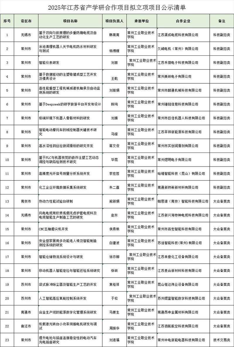 日前,江蘇省科技廳公示了2025年省產(chǎn)學(xué)研合作項目擬立項名單,我校23個項目成功獲批,立項數(shù)較2024年增長27%,持續(xù)位居全省高職院校前列。項目涵蓋科技副總類(12項)、產(chǎn)學(xué)研大會類(10項)和技術(shù)交易類(1項),充分體現(xiàn)學(xué)校在服務(wù)人工智能、智能制造等區(qū)域產(chǎn)業(yè)關(guān)鍵技術(shù)領(lǐng)域的能力。