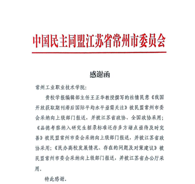 近日,中國民主同盟常州市委員會專門向我校發來感謝函,對我校學報編輯部主任、民盟支部副主委王正華研究員在社情民意研究與建言方面取得的突出成績表示誠摯感謝。王正華撰寫的多篇高質量社情民意信息,經民盟常州市委會采納報送后,先后獲江蘇省政協、全國政協及江蘇省辦公廳等上級部門采用,充分彰顯了我校教師立足專業、心系民生、服務社會的責任擔當與建言獻策的過硬能力。