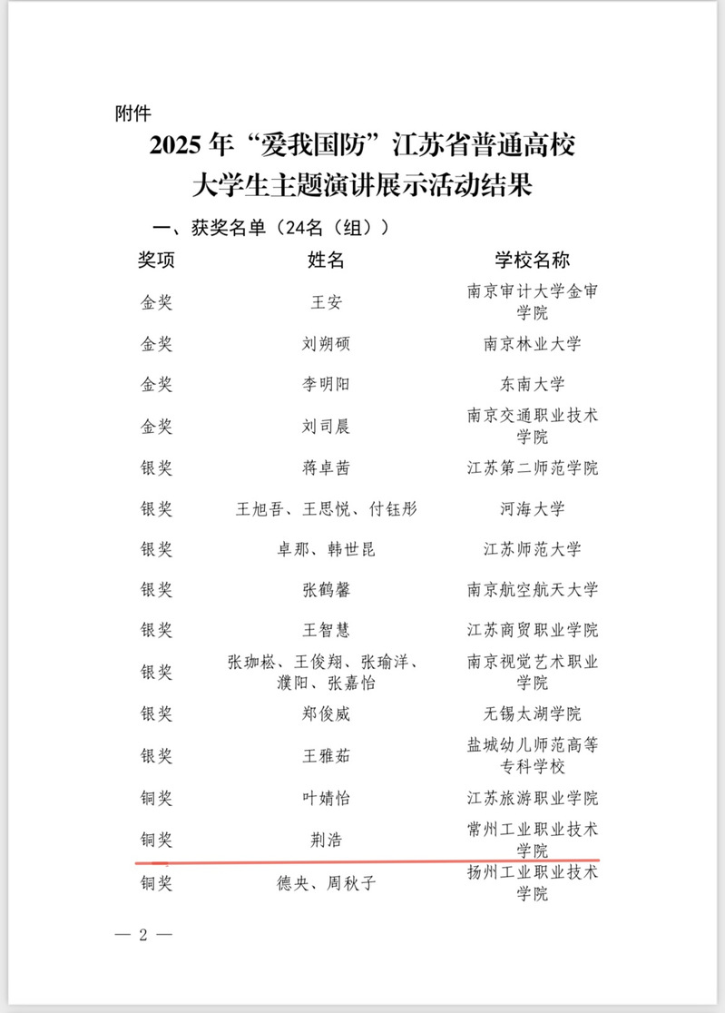 在2025年“愛(ài)我國(guó)防”江蘇省普通高校大學(xué)生主題演講展示活動(dòng)中,我校數(shù)字商務(wù)學(xué)院學(xué)生荊浩的作品《精神的接力棒:從烽火歲月到青春征程》榮獲銅獎(jiǎng),陶莉、馬潤(rùn)萱老師獲評(píng)“優(yōu)秀指導(dǎo)老師”榮譽(yù)稱號(hào)。演講以生動(dòng)的歷史敘事和真摯的當(dāng)代感悟,串聯(lián)起不同時(shí)代為國(guó)奉獻(xiàn)的感人故事,并結(jié)合同輩獻(xiàn)身國(guó)防事業(yè)的戎旅生涯和選手自身參與國(guó)防宣講的經(jīng)歷,表達(dá)了新時(shí)代青年傳承精神、強(qiáng)國(guó)有我的決心。該獎(jiǎng)項(xiàng)的獲得,體現(xiàn)了我校在通過(guò)多樣形式深化學(xué)生國(guó)防觀念、培養(yǎng)愛(ài)國(guó)主義情懷方面的有效成果。