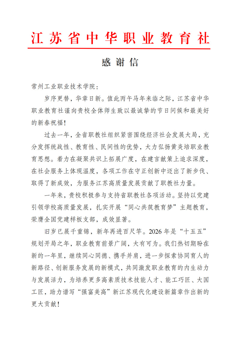 2月12日,江蘇省中華職業(yè)教育社向我校發(fā)來(lái)感謝信,對(duì)我校在2025年對(duì)省職教社工作的支持以及為職業(yè)教育發(fā)展所做出的貢獻(xiàn)表達(dá)了誠(chéng)摯謝意。